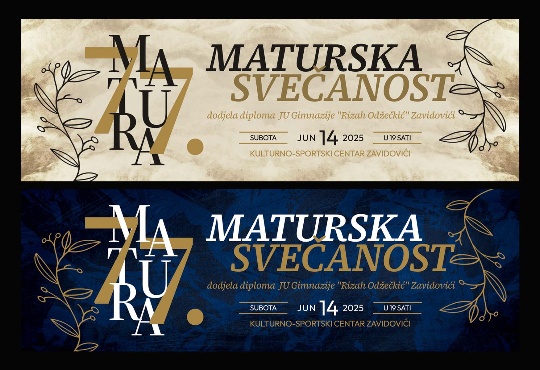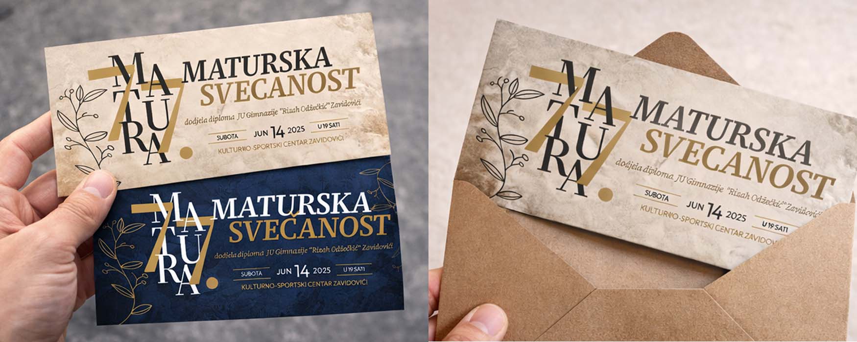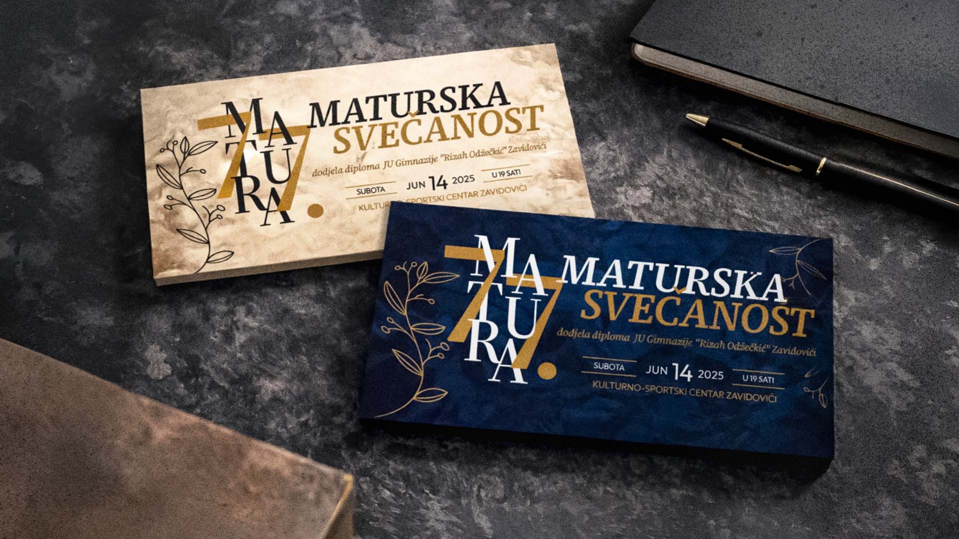 For JU Gimnazija “Rizah Odžečkić” Zavidovići, I designed a set of graduation invitations to commemorate the senior class’s milestone. The school — officially named Gimnazija “Rizah Odžečkić” after its long-standing history and contribution to education in Zavidovići — required invitations that felt both professional and respectful of the occasion.
